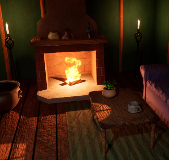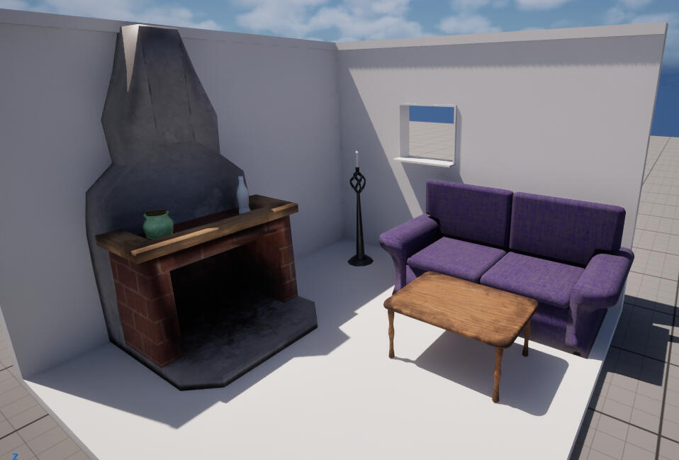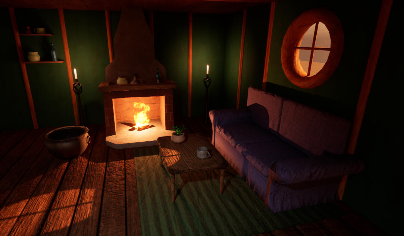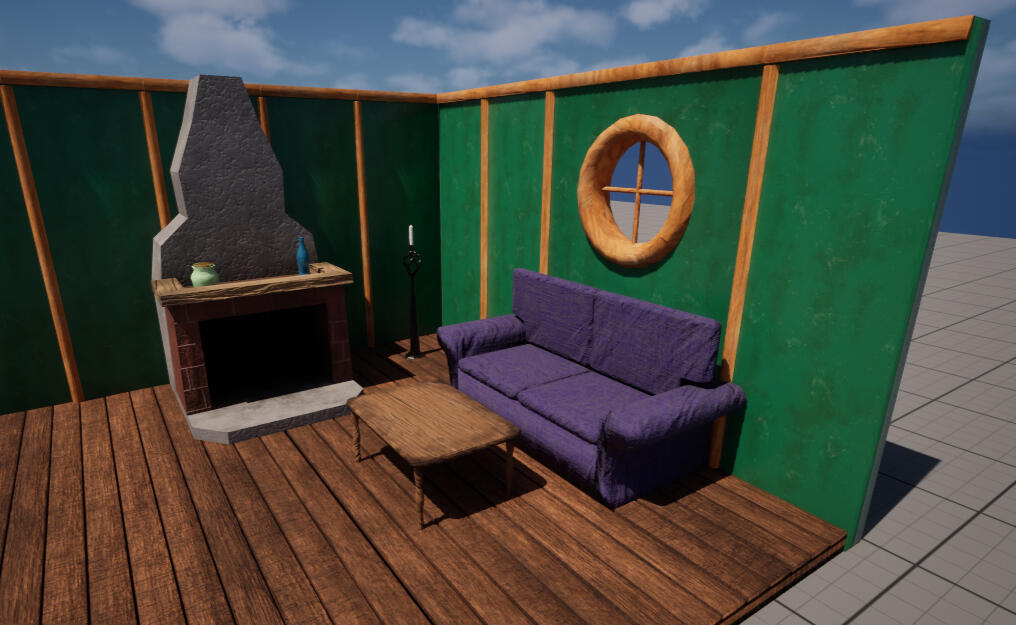 During our 3 week long course I decided to make a cozy living room in a witch's hut, where walls and beams are modular pieces