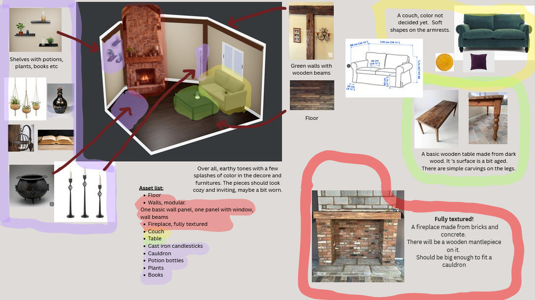 During our 3 week long course I decided to make a cozy living room in a witch's hut, where walls and beams are modular pieces
